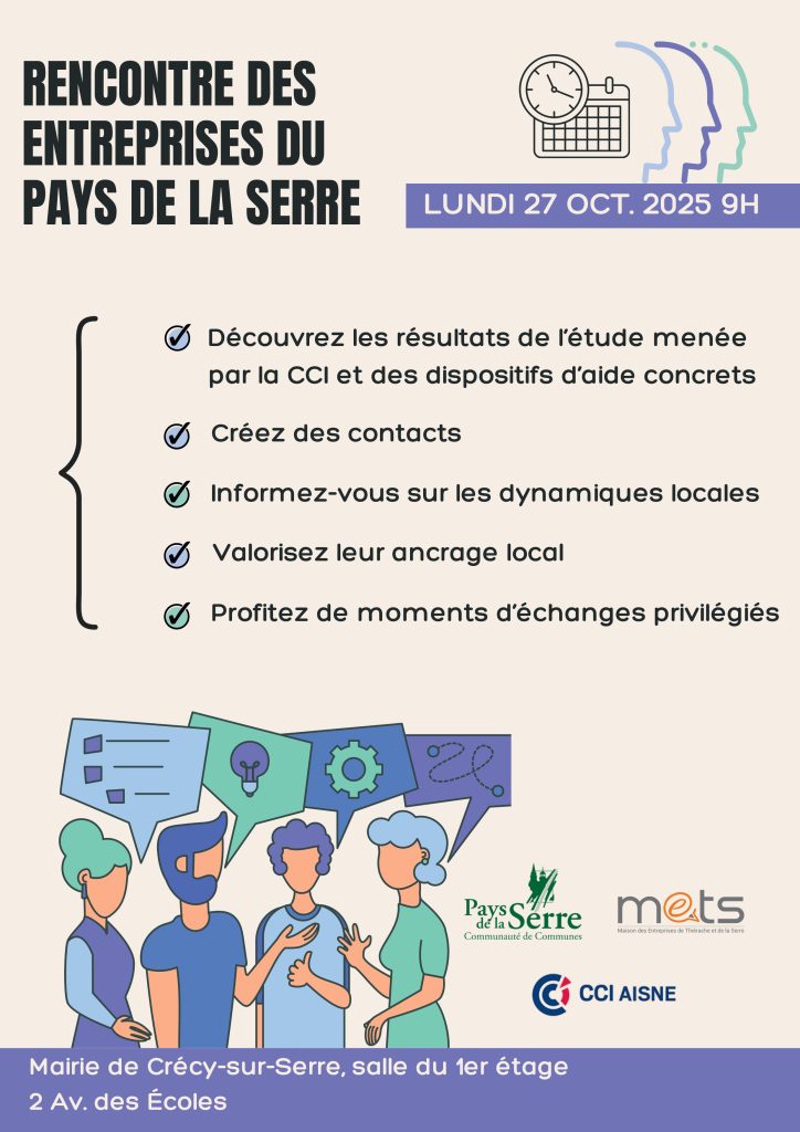 La Communauté de communes du Pays de la Serre organise une rencontre économique à destination des entreprises et acteurs locaux, le lundi 27 octobre 2025 à 9h, à la mairie de Crécy-sur-Serre (salle du 1er étage).